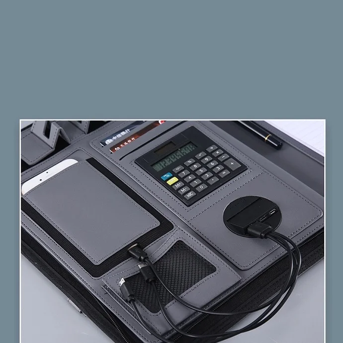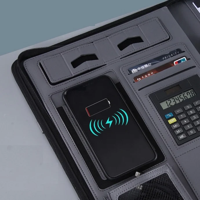 Bìa folder tích hợp sạc không dây và máy tính thiết kế bìa da PU , nẹp tài liệu, 1 máy tính, các ngăn đựng card và giấy tờ được thiết kế logic, sang trọng. Với nguồn pin dự trữ 8000mAh , còn có sạc không dây và 1 cổng usb, 1 lightning, 1 micro