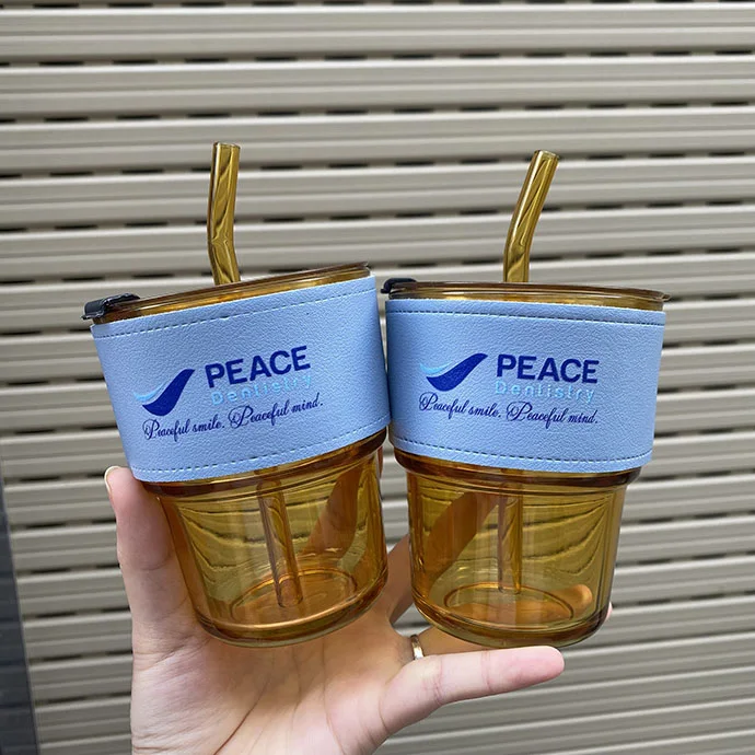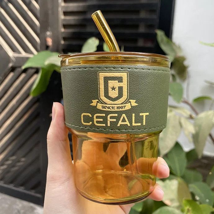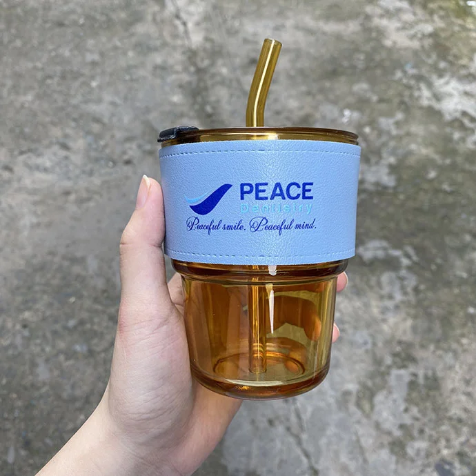 - Cốc thủy tinh có nắp, ống hút và bao da đi kèm.