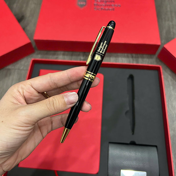 Bút ký thiết kế hiện đại, cầm chắc tay, mực viết trơn mượt. Logo khắc hoặc in tinh tế, giúp thương hiệu xuất hiện thường xuyên trong môi trường làm việc.