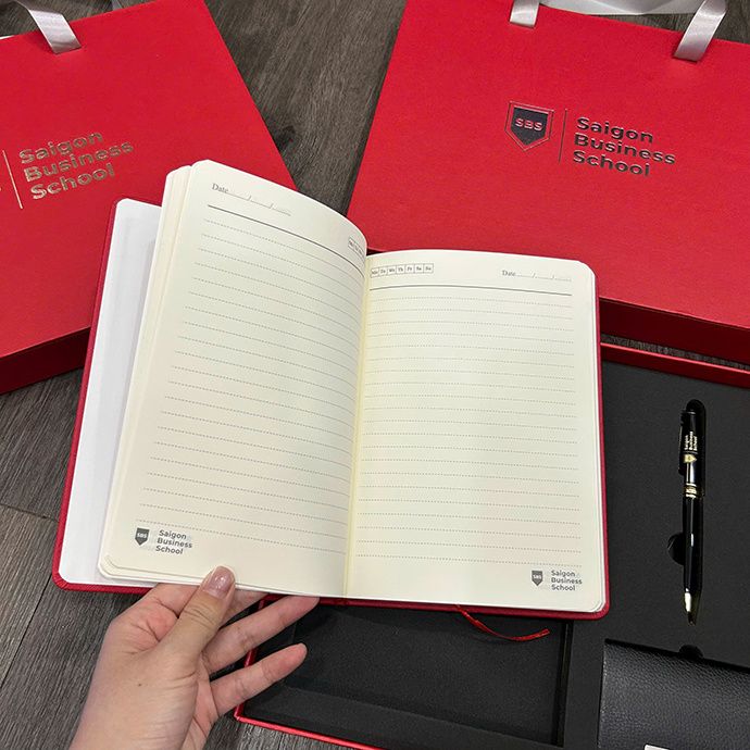 Logo xuất hiện xuyên suốt trên sổ, bút, hộp và túi, giúp tăng độ nhận diện thương hiệu lâu dài.