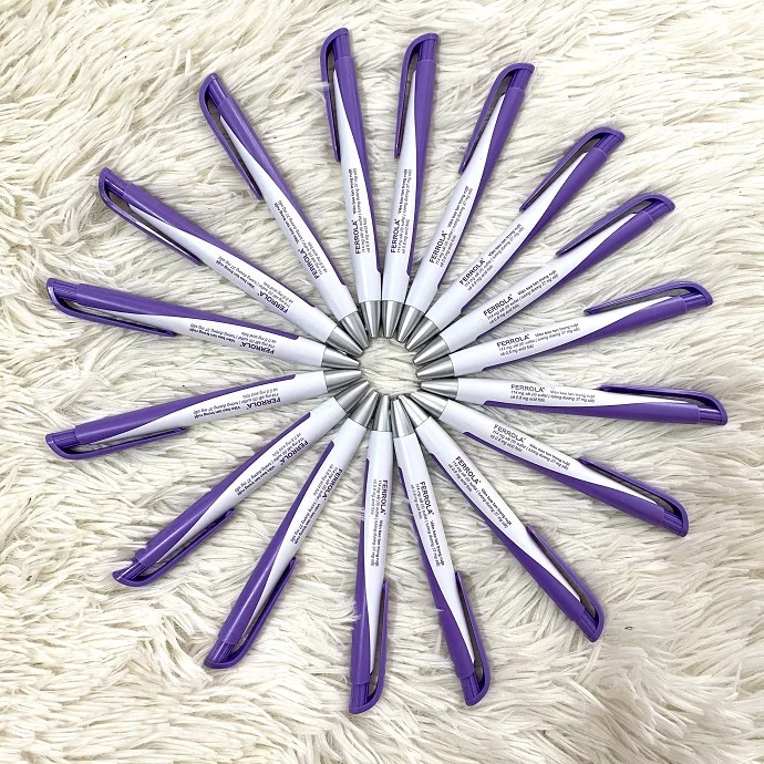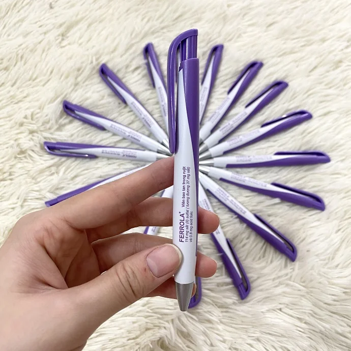 Bút bi nhựa được thiết kế màu trắng phối tím tạo nên sự trang nhã, tinh tế in logo ferrola và thông tin giúp người khác dễ nhìn thấy, tạo nên ấn tượng.