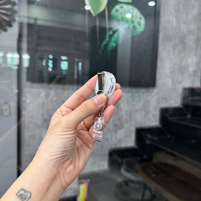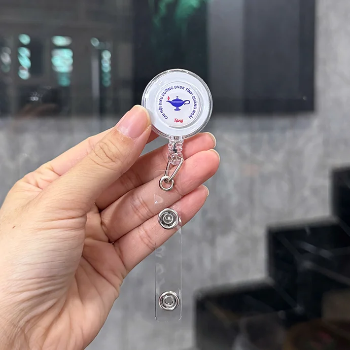 Dây đeo thẻ rút tự động thường được dùng trong môi trường công sở, bệnh viện, trường học hoặc sự kiện. Dây có dạng tròn vỏ nhựa trong suốt, tích hợp cuộn dây rút và kẹp áo bằng kim loại chắc chắn phía sau. Phía dưới là đầu móc nhựa kèm nút bấm để gắn thẻ nhanh chóng và tiện lợi. Thẻ được in logo thương hiệu nhằm đồng nhất trong môi trường học tập và làm việc.