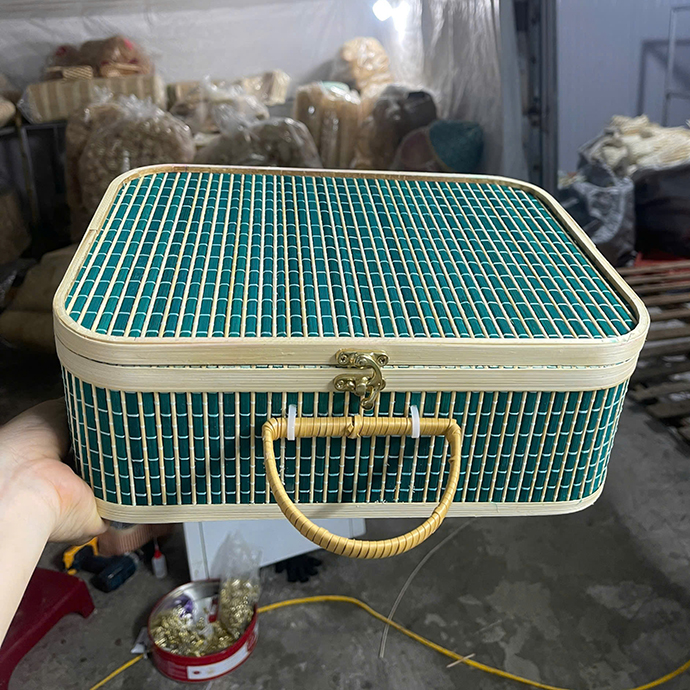 Giỏ tre được làm hoàn toàn từ tre tự nhiên, đan thủ công tỉ mỉ, mang lại sự chắc chắn và tính thẩm mỹ cao. Với thiết kế hình hộp vuông bo góc, tay cầm tre bọc dây rất chắc chắn và khóa gài kim loại, sản phẩm vừa đẹp vừa tiện mang theo.