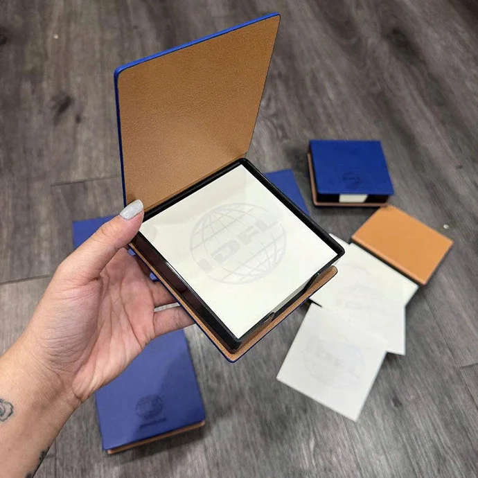 Hộp giấy note da sang trọng, thiết kế vuông vắn hiện đại với lớp bọc giả da cao cấp bên ngoài. Bên trong là giấy note trắng trơn in logo thương hiệu tinh tế, mang đến sự chuyên nghiệp, gọn gàng cho không gian làm việc.