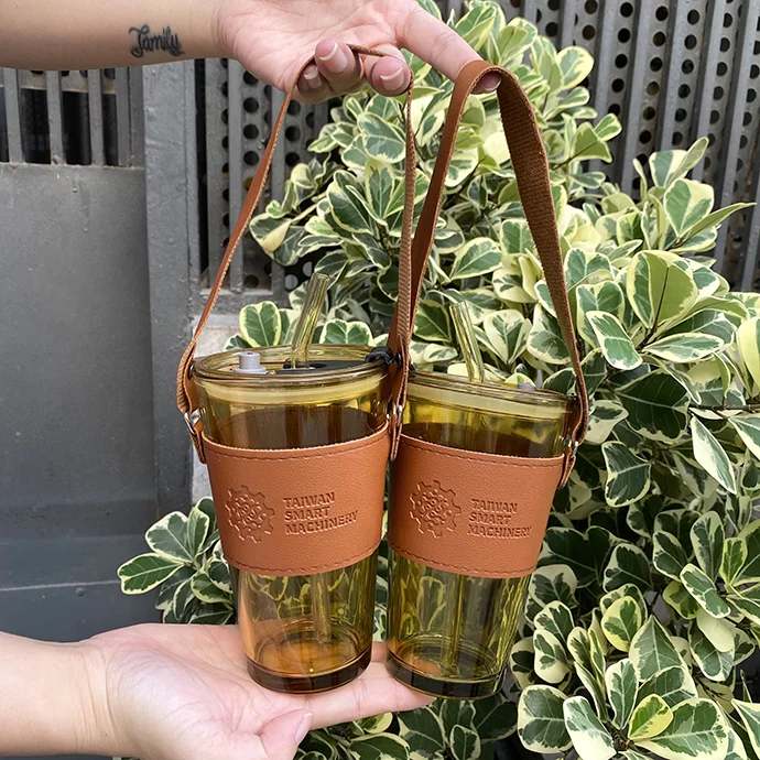 - Ly thuỷ tinh có vỏ da kèm nắp, ống hút và dây treo.