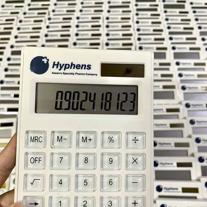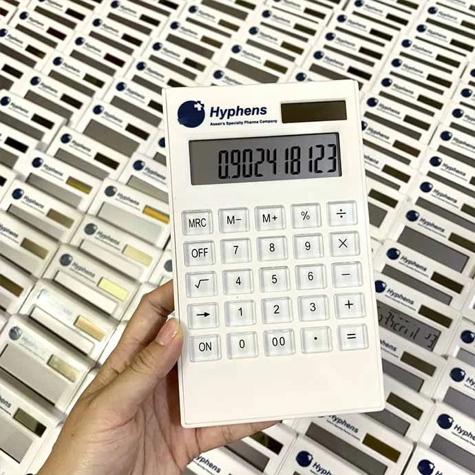 Máy tính cầm tay thiết đơn giản, mỏng nhẹ. Sử dụng pin tiểu hoặc năng lượng mặt trời. Được đặt làm quà tặng in logo Hyphens, Phù hợp làm quà cho các nhà thuốc, cửa hàng kinh doanh, học sinh, khách hàng,...