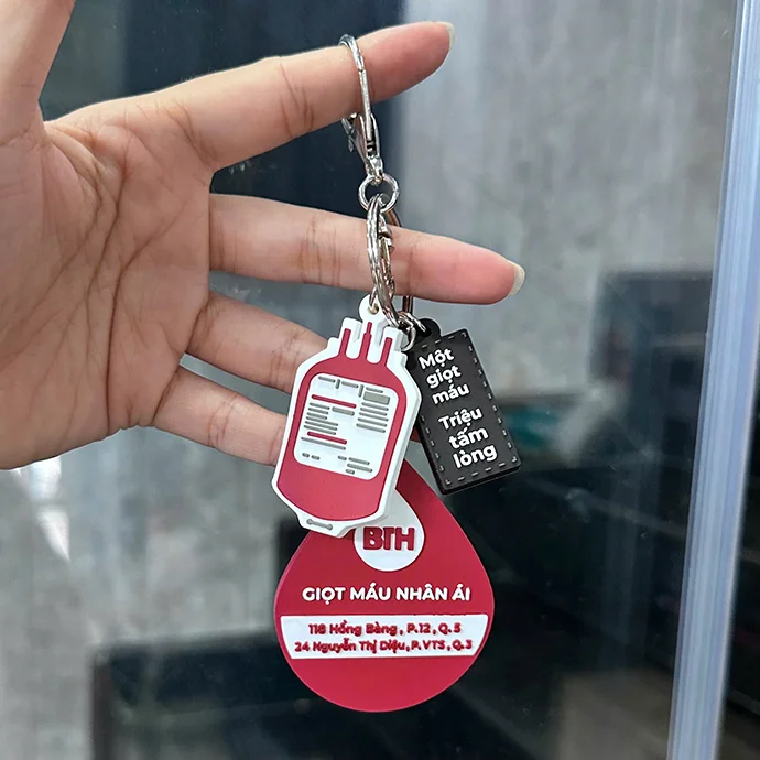 Móc khóa cao su dẻo với thiết kế hình giọt máu và túi máu ngộ nghĩnh, nổi bật với thông điệp "Một giọt máu - Triệu tấm lòng''. Sản phẩm được thiết kế theo yêu cầu của khách hàng, đây là một món quà vô cùng ý nghĩa dành cho người nhận.