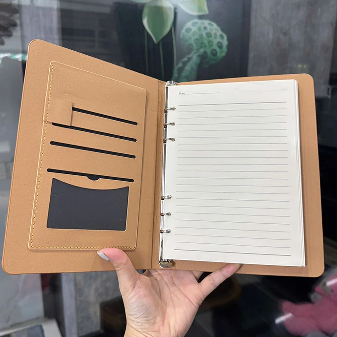 Phụ kiện kèm theo: Có thể gắn kèm bút, túi đựng namecard, thước đo, dây cột sổ…