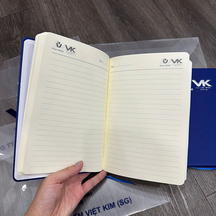 🔹 Ruột sổ đa dạng – Giấy trắng kẻ ngang, giấy kraft hoặc giấy trơn tùy chọn, in logo 1 vị trí.