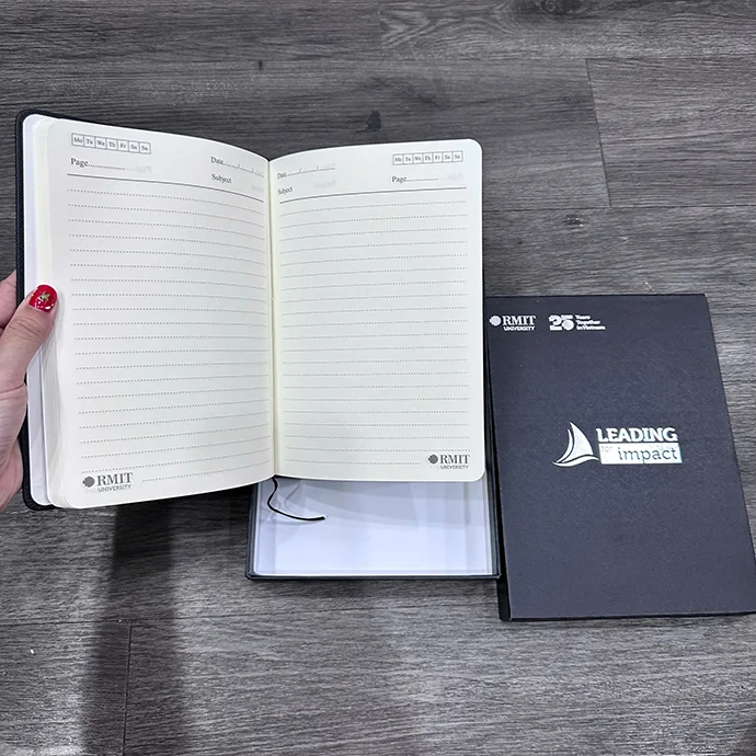 Sổ tay bìa da in logo không đơn thuần là một cuốn sổ – mà là tuyên ngôn tinh tế về tư duy lãnh đạo, học thuật và đổi mới. Được thiết kế riêng cho dịp 25 năm RMIT tại Việt Nam, cuốn sổ là hiện thân của hành trình tri thức bền vững, được đầu tư chỉn chu từ chất liệu đến thông điệp.