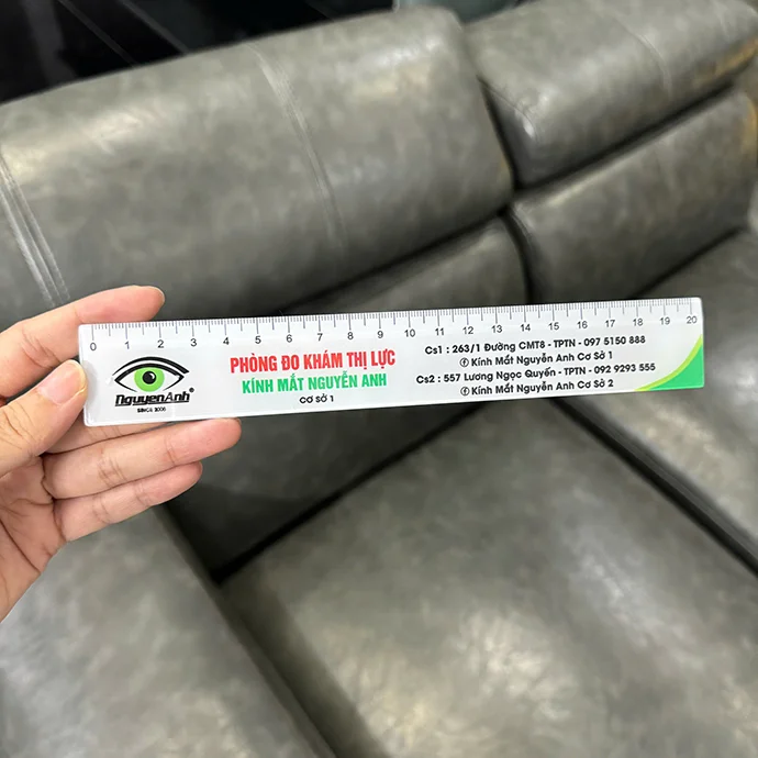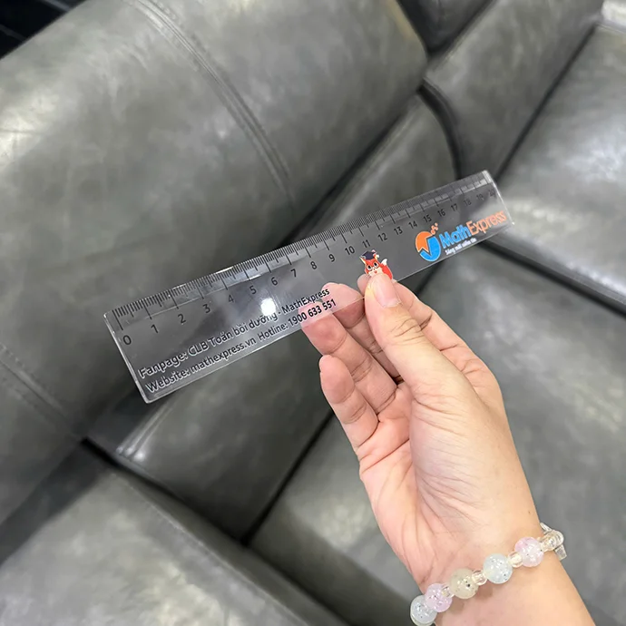 Thước nhựa trong suốt dài 20cm, thiết kế hiện đại, in logo MathExpress nổi bật cùng hình mascot dễ thương, phù hợp làm quà tặng cho học sinh trong các chương trình giáo dục hoặc quảng bá thương hiệu.