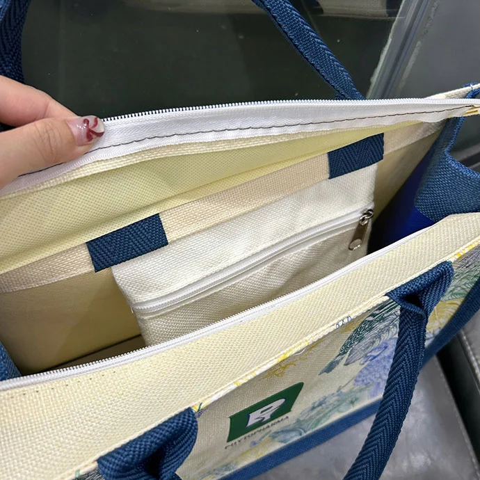 Mẫu túi được thiết kế với họa tiết hoa lá và chim muông tinh tế, kết hợp gam màu xanh – vàng nhẹ nhàng tạo cảm giác tự nhiên và cao cấp. Logo thương hiệu được in nổi bật ở trung tâm giúp tăng khả năng nhận diện.