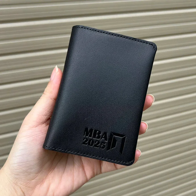 Sản phẩm ví cao cấp màu đen, thiết kế gọn gàng, tinh tế, có dập logo theo yêu cầu. Mặt trong chia thành 2 ngăn tiện lợi, phù hợp để đựng thẻ, tiền, giấy tờ tùy thân. Đây là món quà tặng lí tưởng cho học viên, nhân viên, đối tác trong các chương trình đào tạo, lễ tốt nghiệp hoặc sự kiện doanh nghiệp.