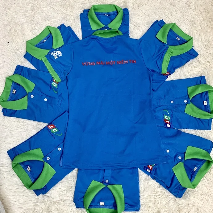 Chất liệu:vải poly 4 chiều ,màu xanh dương ,cổ và tay áo phối màu xanh lá cây nhạt.