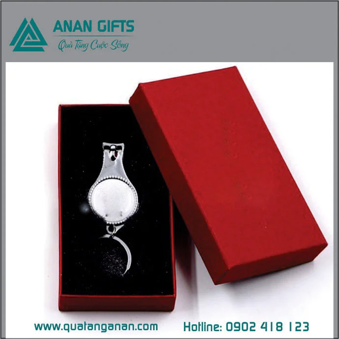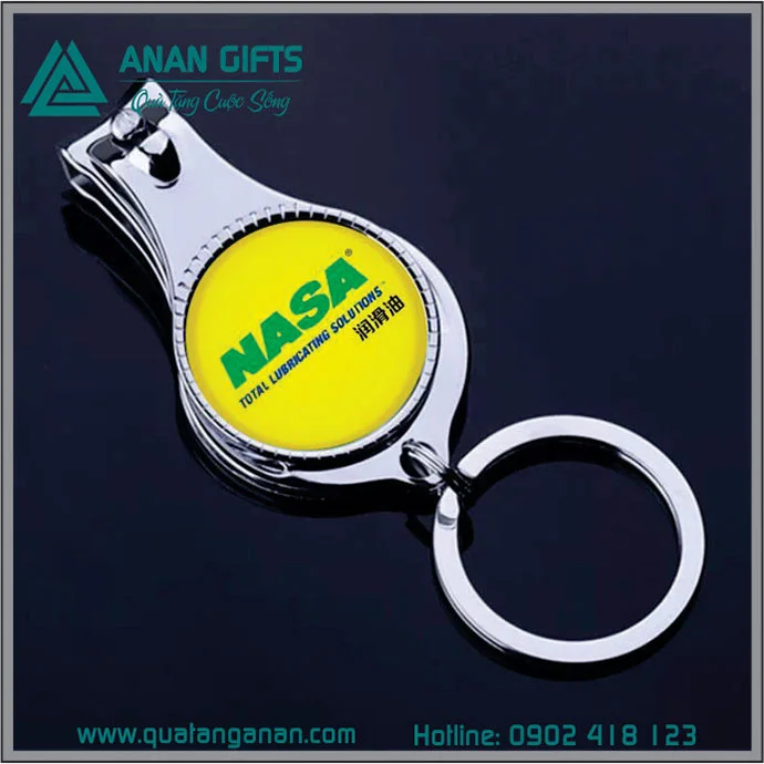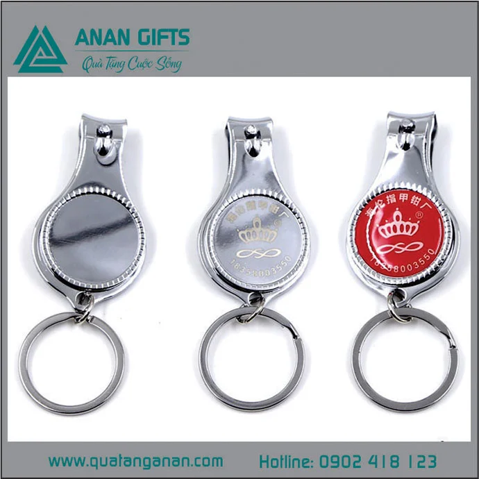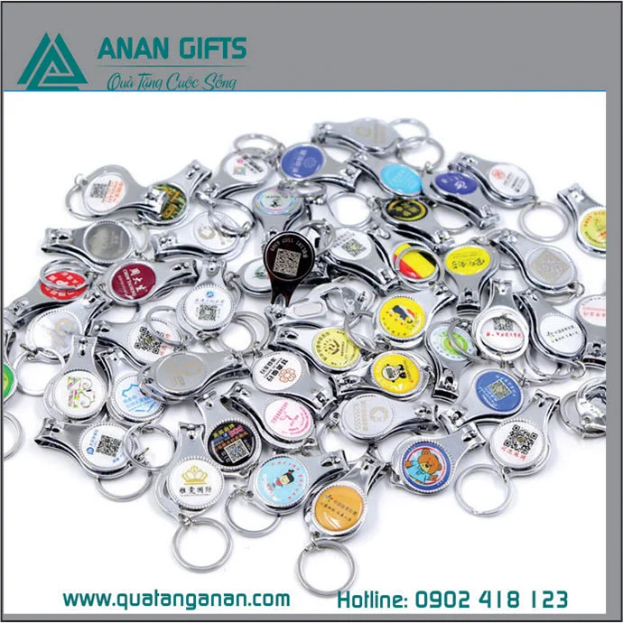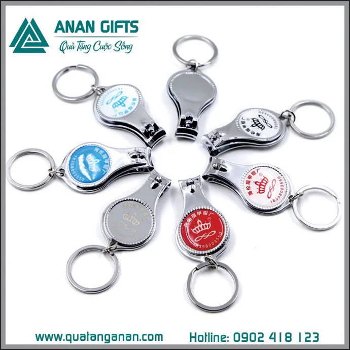Sản phẩm móc khóa kèm bấm móng tay có thể khắc logo hoặc đổ keo logo nhiều màu.