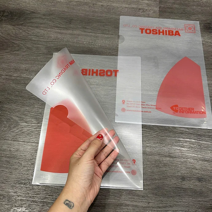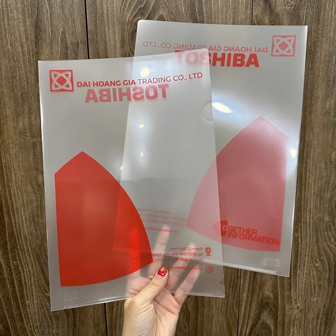 Bìa lá nhựa trong mờ in logo theo yêu cầu là sản phẩm văn phòng tiện dụng, chuyên dùng để lưu trữ, bảo quản và trình bày tài liệu chuyên nghiệp. Với thiết kế trong mờ sang trọng cùng hình in logo Toshiba nổi bật, sản phẩm vừa đảm bảo tính thẩm mỹ vừa quảng bá thương hiệu hiệu quả.