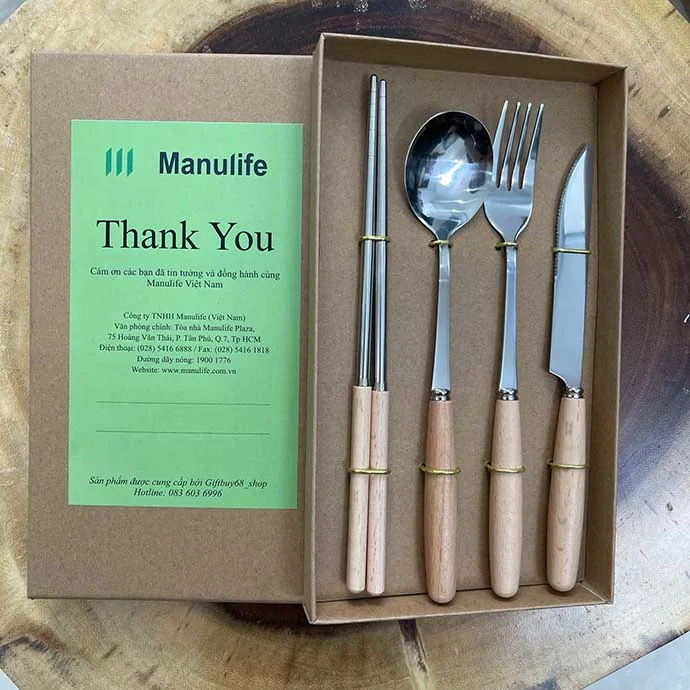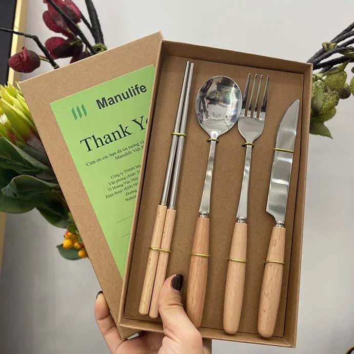 Bộ sản phẩm bao gồm : đũa, thìa, nĩa, dao và kèm hộp đựng