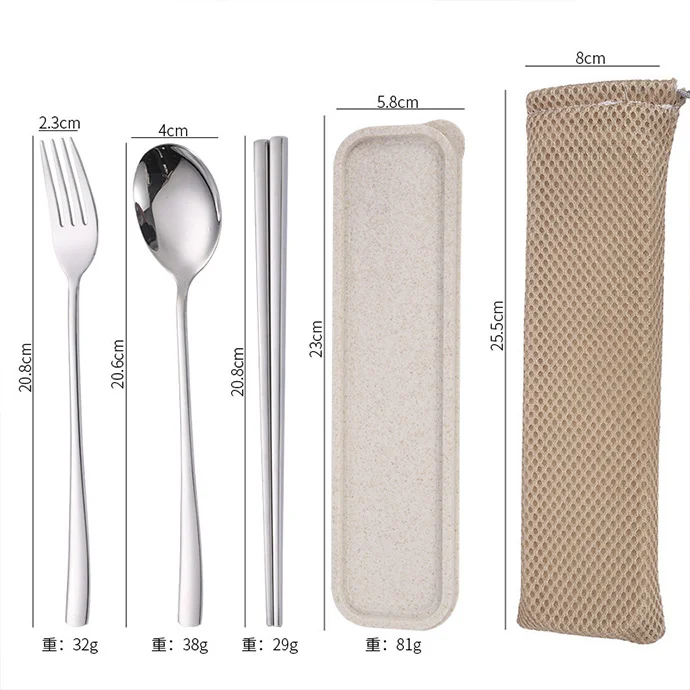 Bộ sản phẩm gồm: Đũa, muỗng, nĩa inox trơn, hộp nhựa PP và túi bọc bên ngoài. Gía bán lẻ 79,000
