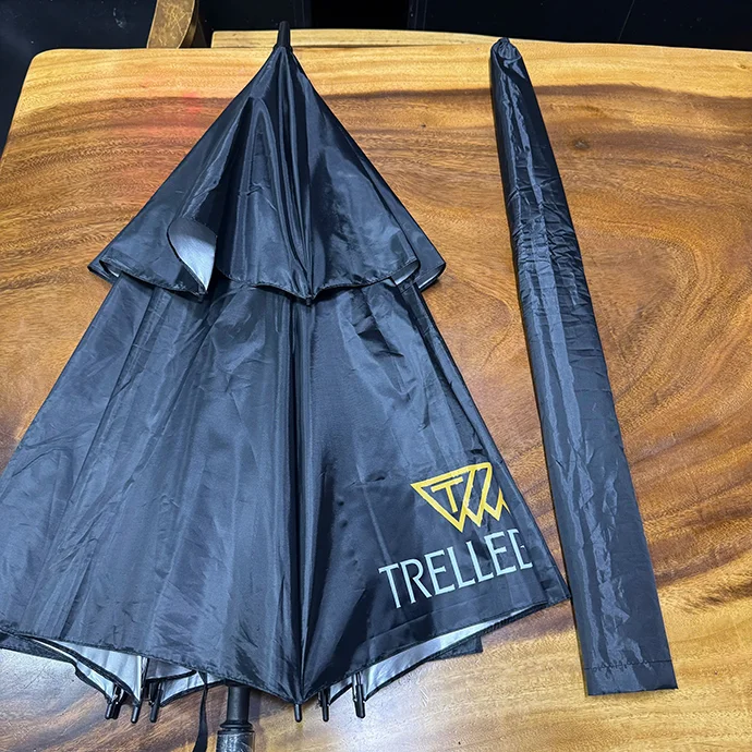 Mẫu dù trong hình có thiết kế hai tầng chống gió, khung chắc chắn, màu sắc sang trọng cùng logo in sắc nét, tạo nên hình ảnh chuyên nghiệp cho thương hiệu.