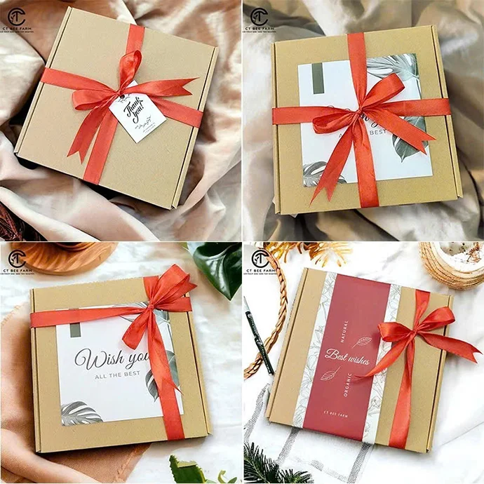 - Hộp đựng carton gói quà kèm dây ruy băng thắt nơ và dán logo công ty.