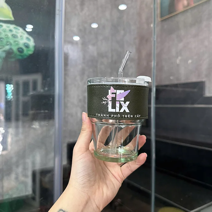 Ly thủy tinh bọc da in logo với thiết kế hiện đại, tiện dụng kèm nắp nhựa trong suốt và ống hút thủy tinh đi kèm. Sản phẩm được in logo "FLIX - Thành phố trên cây", mang đậm phong cách sáng tạo và bảo vệ môi trường.