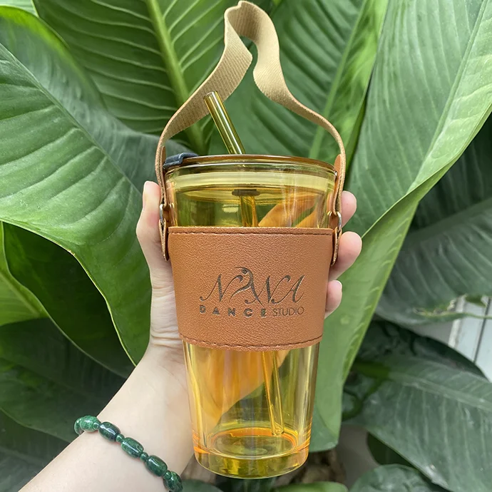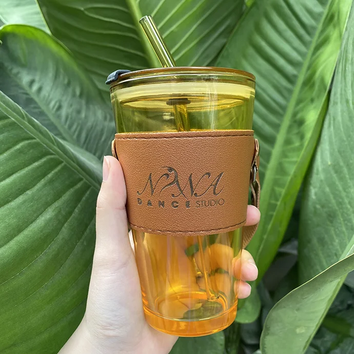 - Cốc thủy tinh có nắp, ống hút và bao da đi kèm.