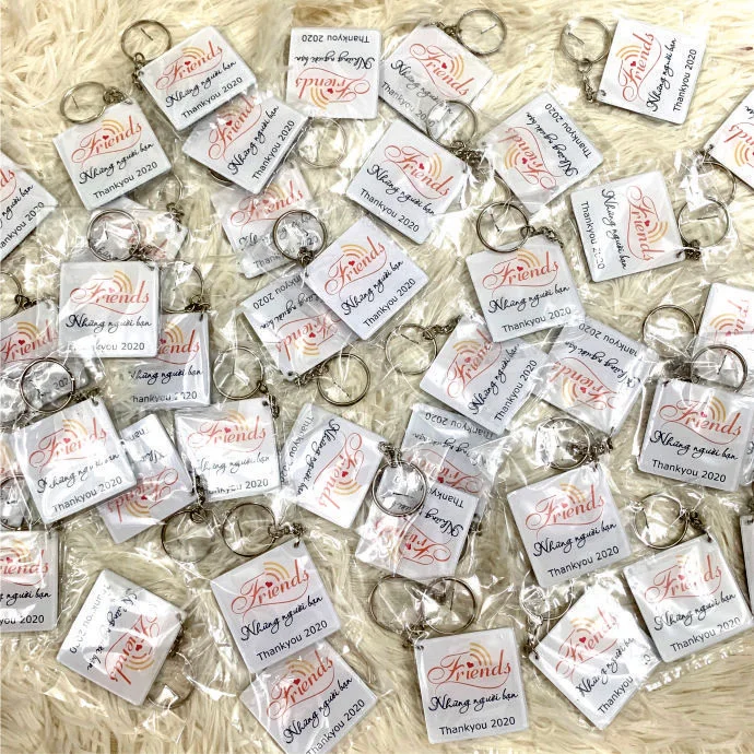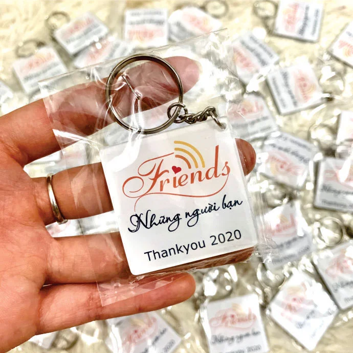 Móc khóa mica in logo friends được đặt làm theo yêu cầu với chất liệu mica, hình vuông, có khoen móc khóa kim loại, in thông tin 2 mặt.