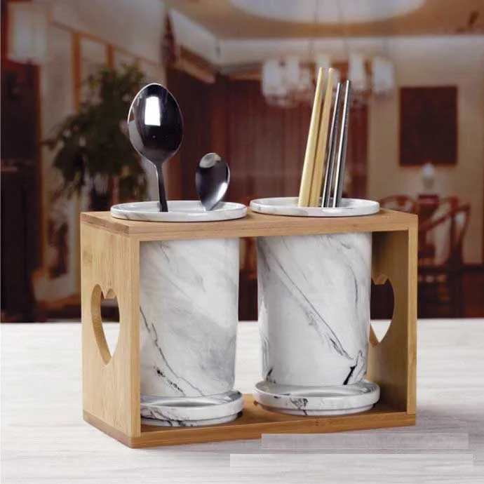 Ống đựng đũa muỗng bằng sứ có khay gỗ đi kèm.