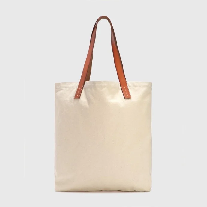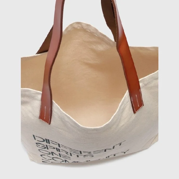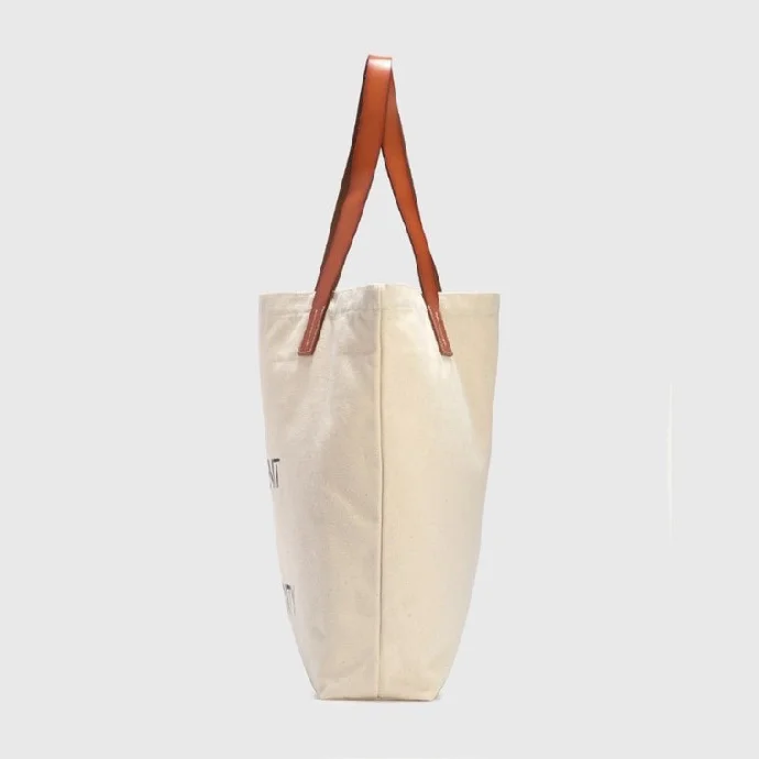 Vải cotton dày bên ngoài, tay cầm trên bằng da, logo khẩu hiệu in phía trước.