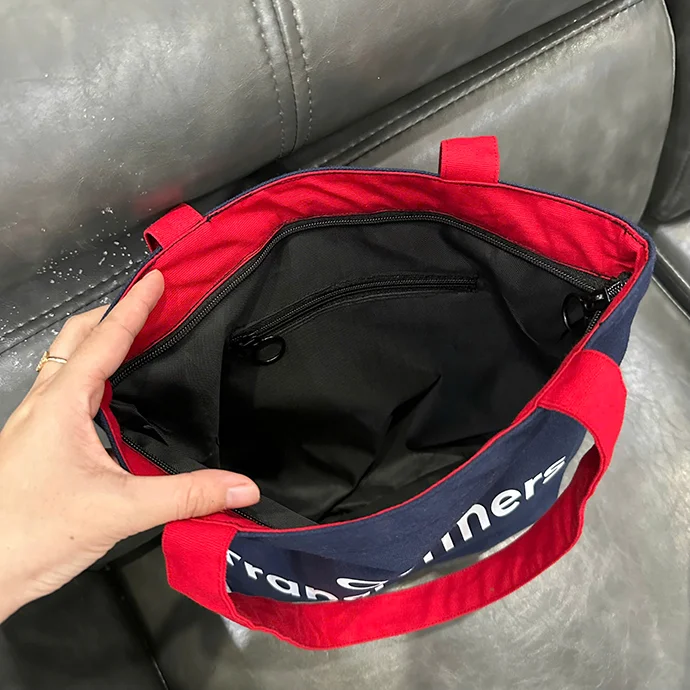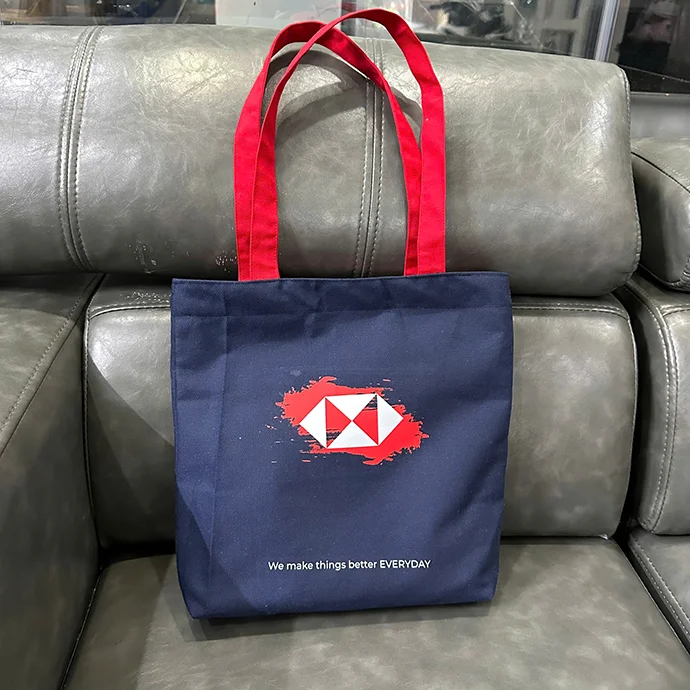 Màu sắc: Thân túi xanh navy, quai đỏ nổi bật, in chữ trắng rõ nét.