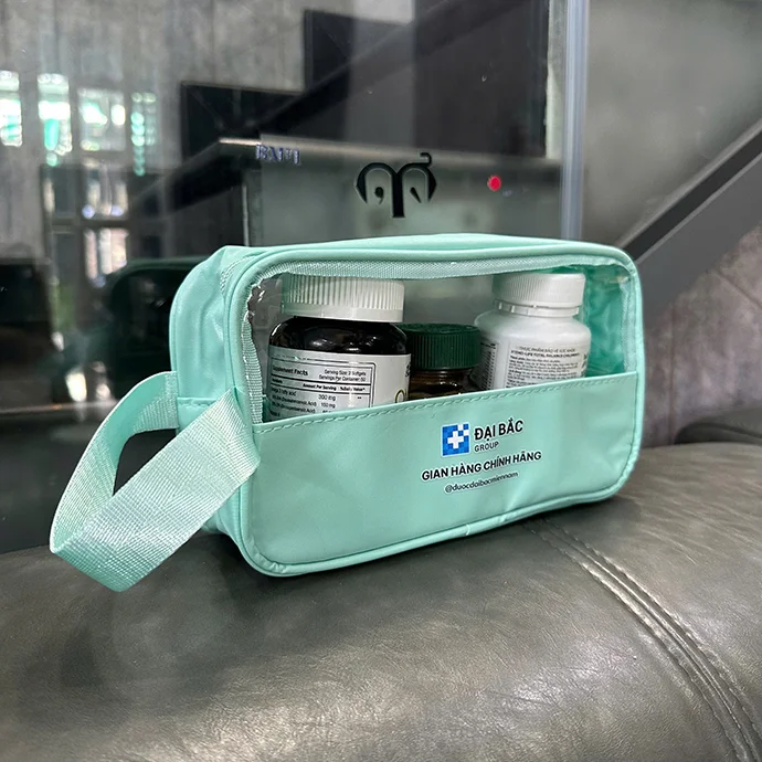 Túi đựng mỹ phẩm trong suốt in logo được làm từ chất liệu bền đẹp, thiết kế gọn nhẹ, có quai cầm tiện dụng. Phù hợp để đựng mỹ phẩm, thực phẩm chức năng, dược phẩm hoặc đồ dùng cá nhân khi đi làm, đi học, du lịch.