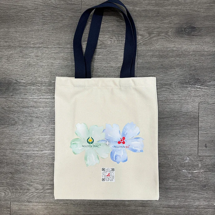 Túi vải canvas cao cấp với thiết kế tối giản, phối họa tiết hoa nhẹ nhàng cùng logo thương hiệu Nguyên Trắc - Nguyên Bá. Sản phẩm sở hữu vẻ đẹp trang nhã, tinh tế, phù hợp sử dụng trong các sự kiện, hội thảo hoặc làm quà tặng doanh nghiệp thân thiện với môi trường.