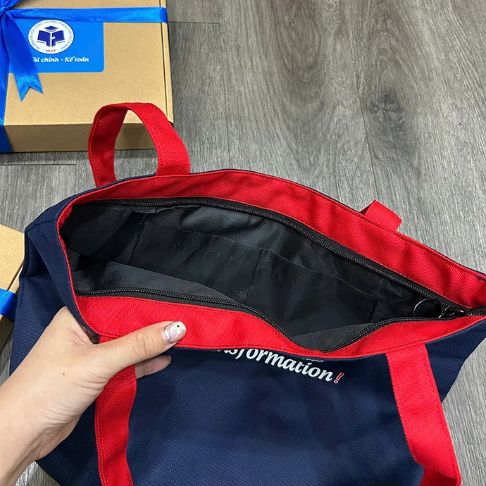 Màu túi: Thân túi xanh đậm, quai xách đỏ nổi bật (có thể thay đổi theo yêu cầu).
